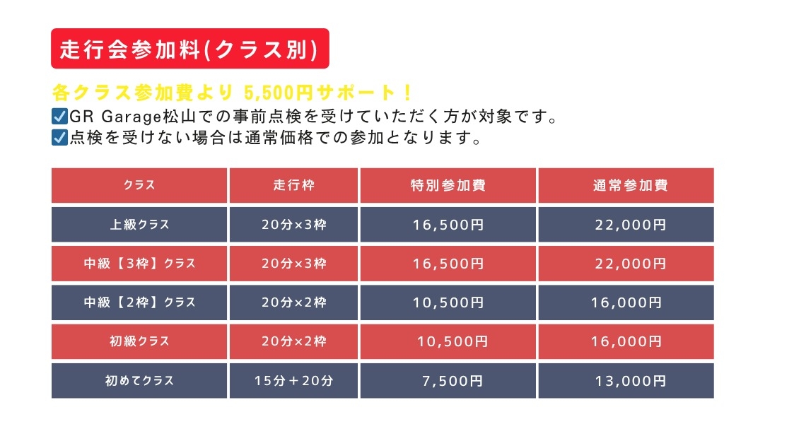 ⓵岡山国際サーキットの申込・詳細案内はまだスタートしていないため、参加料・走行枠につきましては前回開催時の内容を基準としています。今後、変更となる可能性がございますので予めご了承ください。